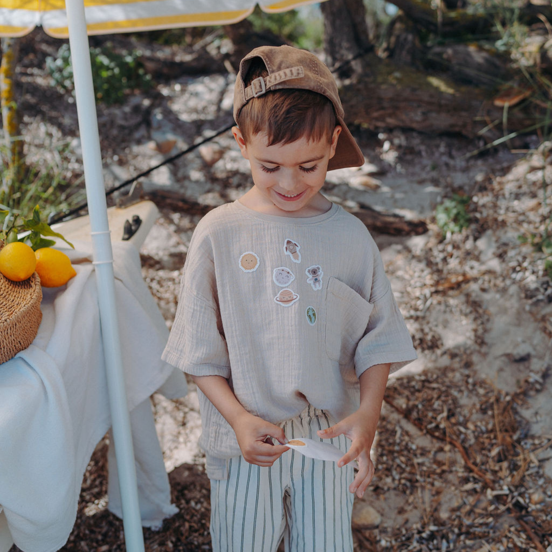 Klebe die pieksmichnicht Patches ganz einfach auf die Kleidung deines Kindes, den Kinderwagen oder das Babybettchen.
